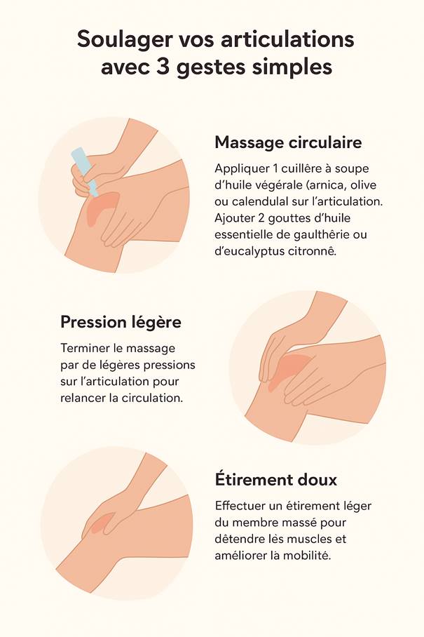 Les massages améliorent la circulation sanguine et apportent de détente musculaire, ce qui réduit les tensions autour des articulations.