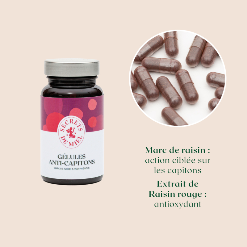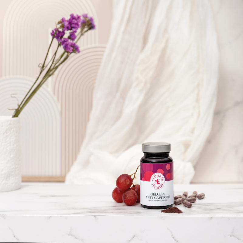 Les Gélules Anti-Capitons allient le meilleur des actifs issus de la vigne dans une formule experte, conçue pour cibler l’aspect « peau d’orange ». Le Marc de raisin contribue à lutter contre l’effet peau d’orange en favorisant une action ciblée sur les capitons. Il est associé à un extrait de Raisin rouge titré en polyphénols, reconnus pour leur protection antioxydante.