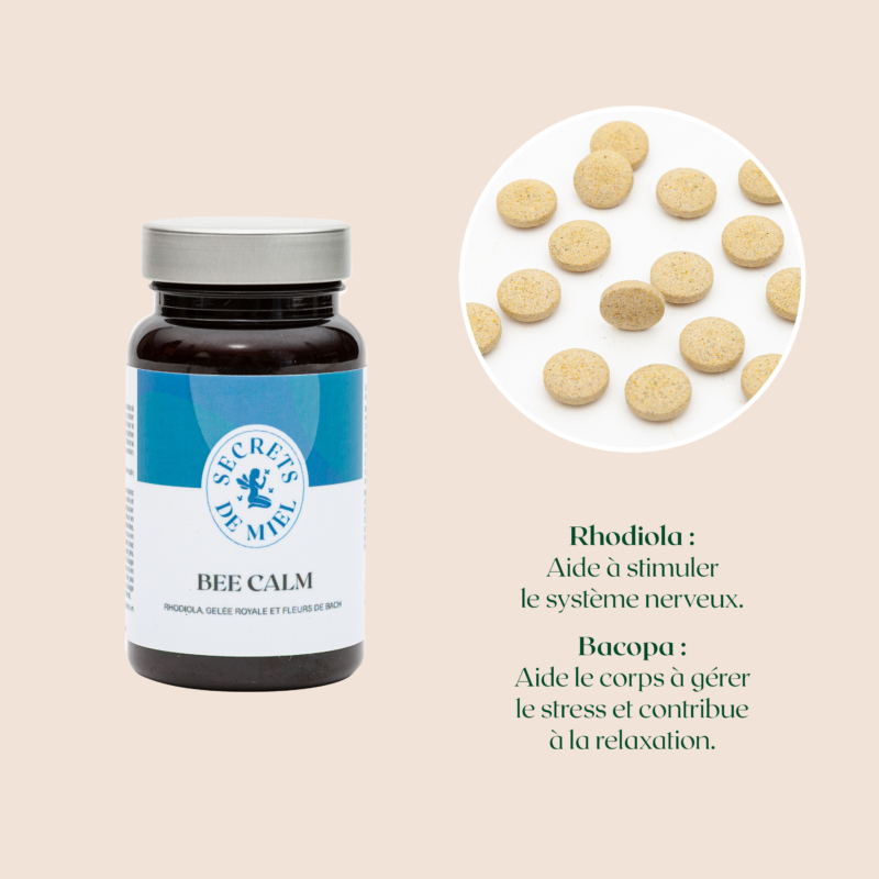 La Rhodiola aide à stimuler le système nerveux. La Bacopa contribue à maintenir l’équilibre mental dans des circonstances stressantes, améliore la résistance du corps au stress et participe à la relaxation. Le Safran est reconnu pour soutenir l’humeur et apaiser le stress. Bee’Calm est ainsi un allié complet pour apaiser corps et esprit, notamment lorsque le rythme s’accélère ou que la charge mentale augmente.