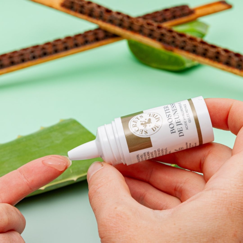 Le Booster de Jeunesse à la Gelée Royale est formulé avec plus de 98,5% d’ingrédients d’origine naturelle. Les % restants assurent l’innocuité, la stabilité et la sensorialité du produit.