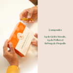 Ingrédients pour 2 ampoules de 10 ml (dose journalière maximale conseillée) : Eau purifiée, Miel (4 000 mg), Extrait aqueux de Pollen (1000 mg), Jus de Pomme concentré (908 mg), Jus d’Orange concentré (908 mg), Gelée Royale lyophilisée (334 mg équivalent à 1002 mg de Gelée Royale), Extrait fluide de Propolis (160 mg).