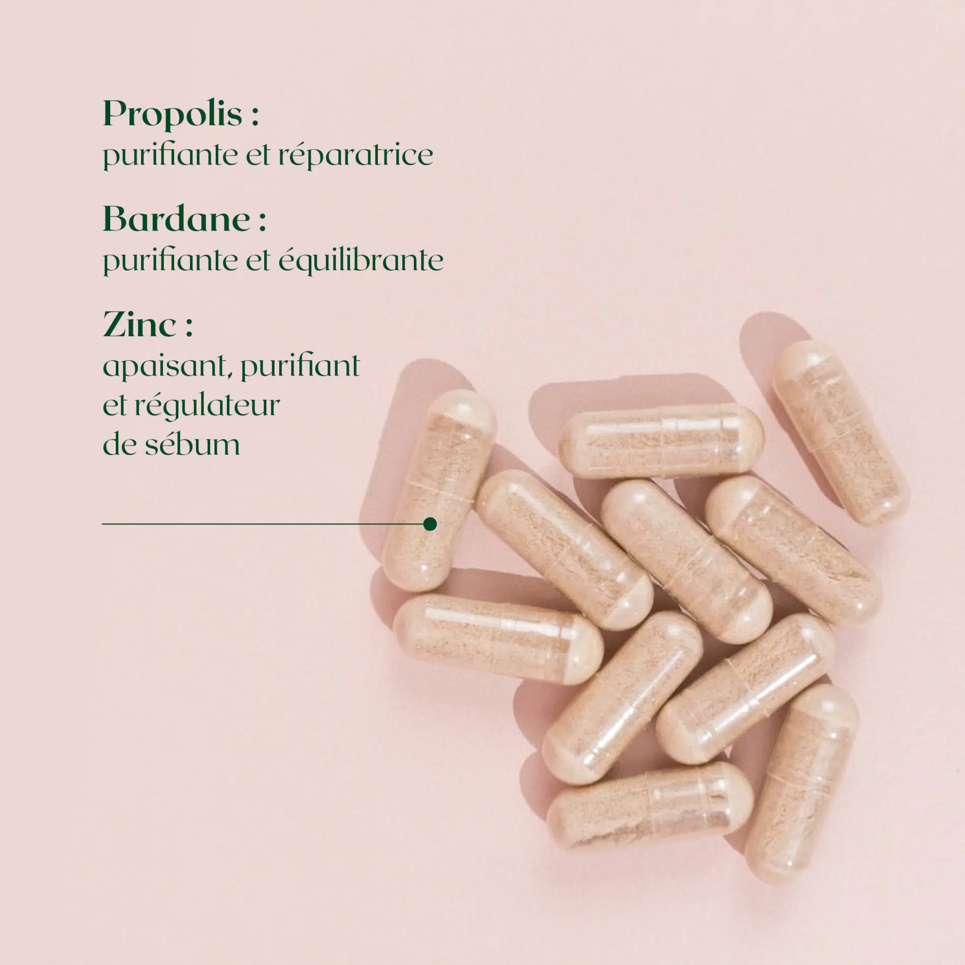 Ce complément alimentaire 100% naturel est formulé avec les meilleurs ingrédients naturels (Bardane, Ortie, Artichaut, Poivre, Zinc et Probiotiques) aux vertus exceptionnelles : antioxydantes, détoxifiantes, dépuratives, antibactériennes et matifiantes.