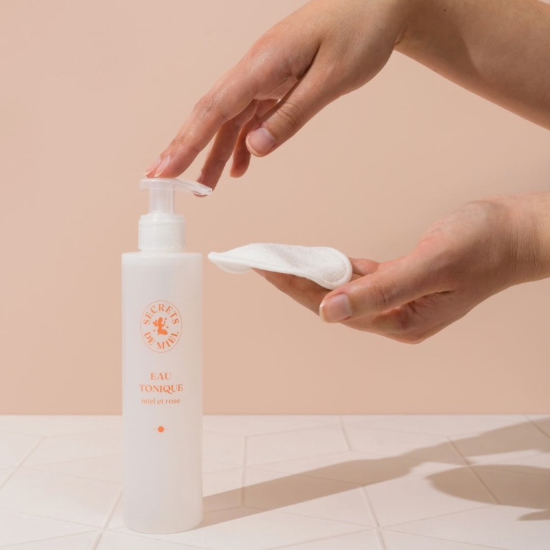 L’Eau Tonique est indispensable pour compléter le rituel quotidien Nettoyage et Démaquillage. Appliquez notre Eau Tonique Miel et Rose sur l’ensemble du visage, du cou et du décolleté pour resserrer les pores, tonifier la peau et la préparer à recevoir tous les bienfaits des soins : sérums, huiles, crème de jour et de nuit !