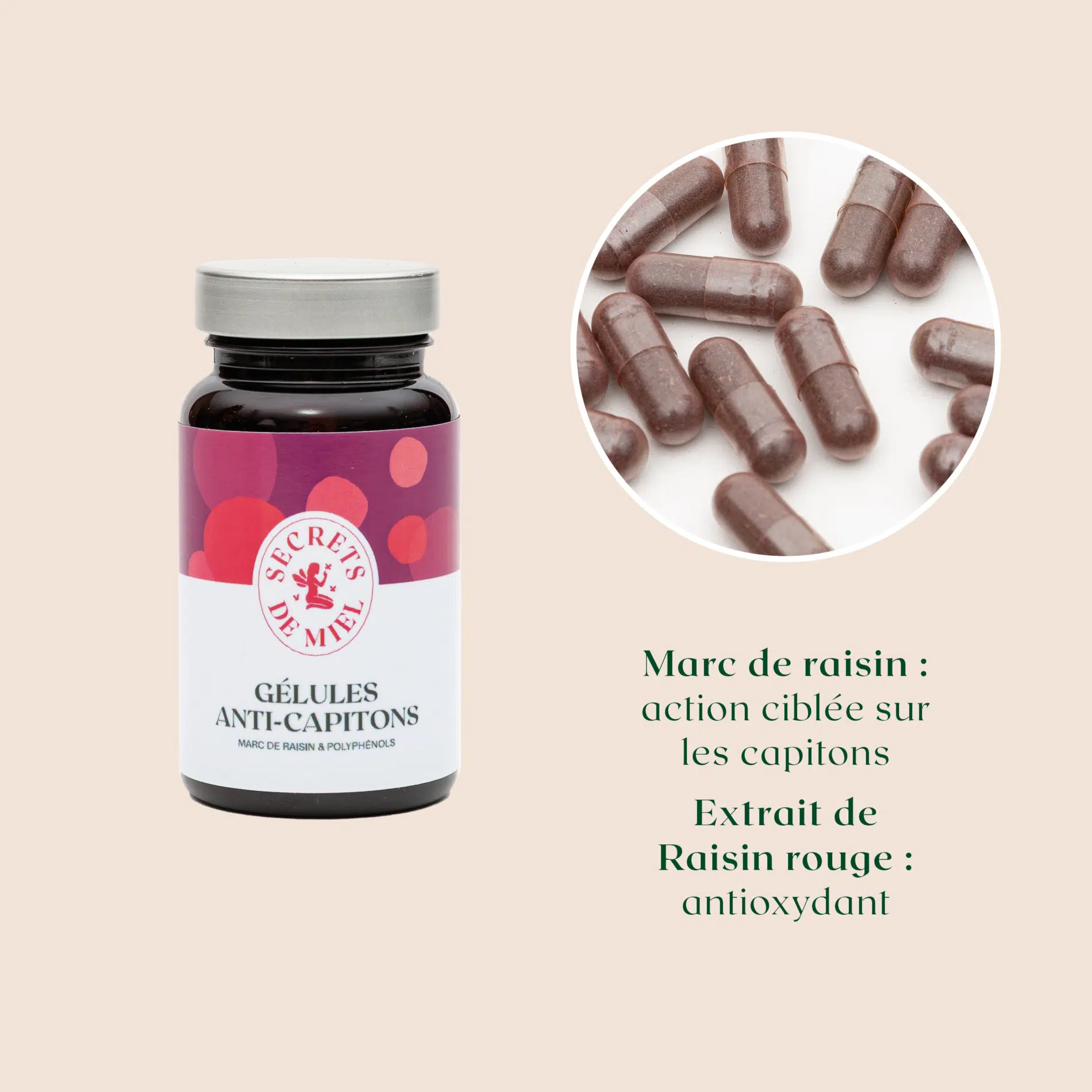 Les Gélules Anti-Capitons allient le meilleur des actifs issus de la vigne dans une formule experte, conçue pour cibler l’aspect « peau d’orange ». Le Marc de raisin contribue à lutter contre l’effet peau d’orange en favorisant une action ciblée sur les capitons. Il est associé à un extrait de Raisin rouge titré en polyphénols, reconnus pour leur protection antioxydante.