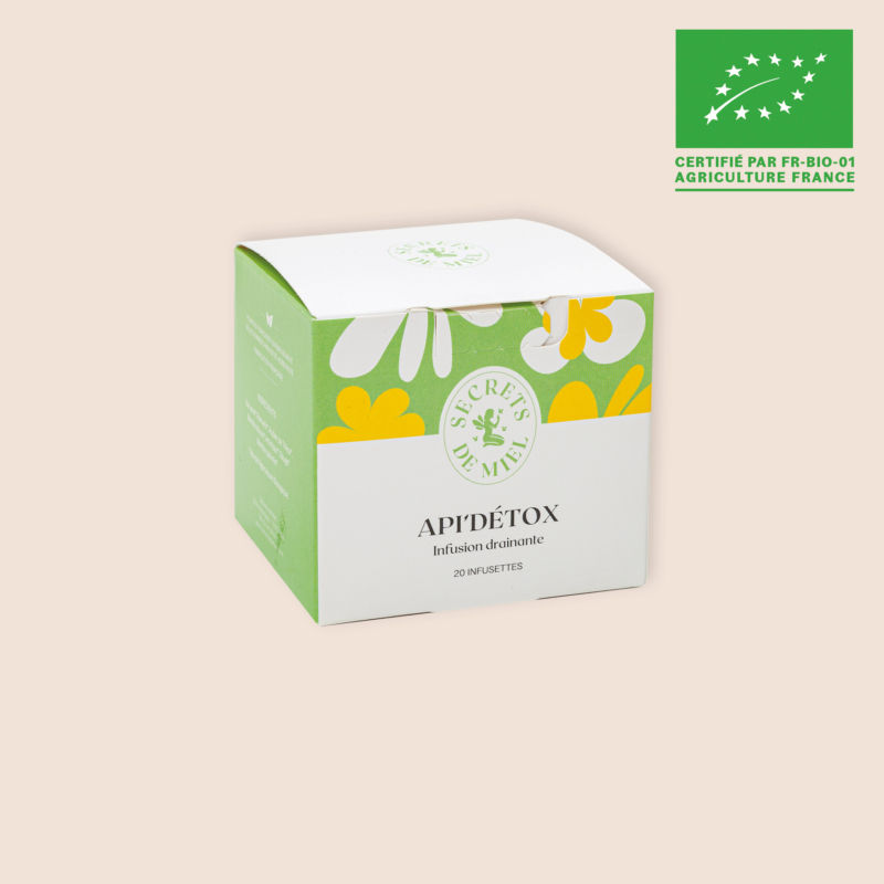 Détoxifiante, drainante et hydratante, l’infusion Api’Détox est une véritable alliée de votre programme détox. Grâce à un assemblage de plantes aux propriétés drainantes exceptionnelles, nos infusettes détox favorisent l’élimination des toxines.