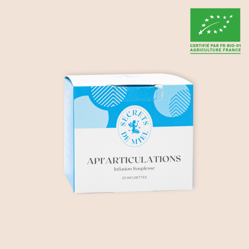 Associez notre Infusion Api’Articulations à notre Complexe Articulations à base de miel et d’extraits de plantes traditionnellement utilisées pour le bon fonctionnement des articulations (Harpagophytum, Cassis, Acérola, Curcuma) qui deviendra vite l’allié de vos articulations pour vous soulager au quotidien.