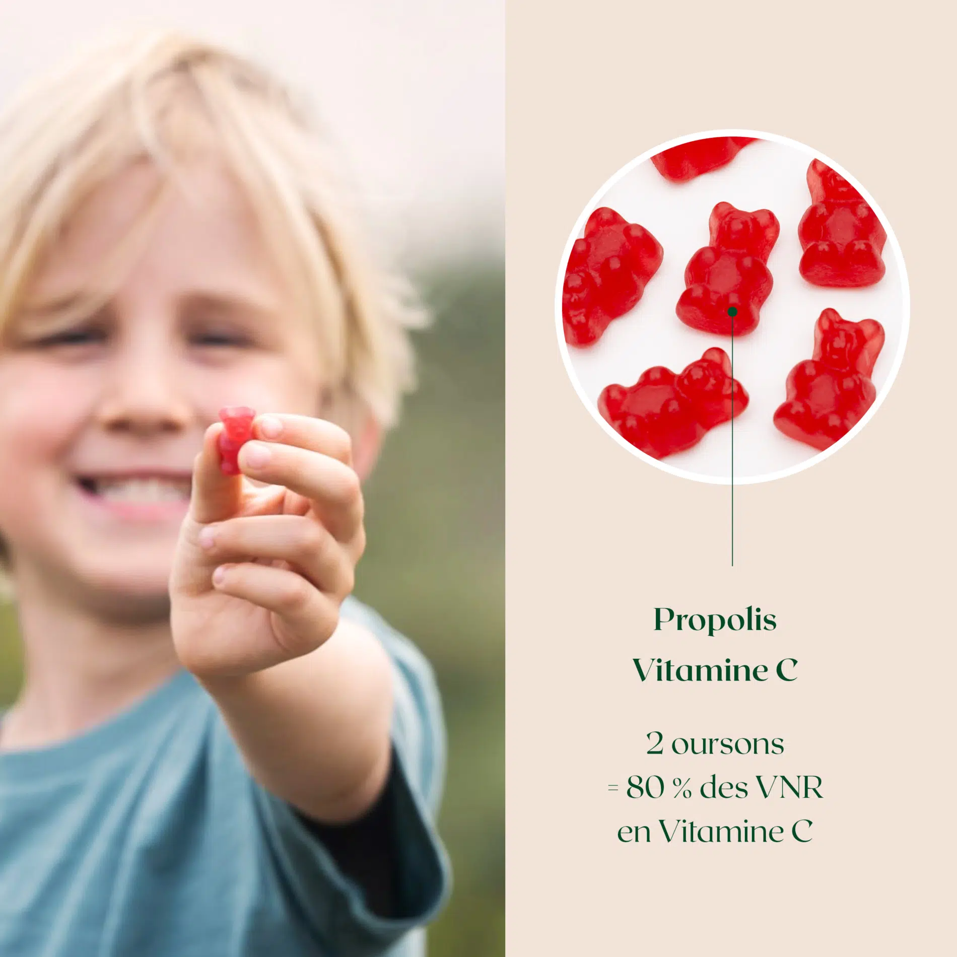 Associez nos Oursons Défenses Naturelles à notre Extrait de Propolis liquide ! Sa promesse ? Rempart bactériostatique de ruche, il sera votre allié face aux agressions extérieures !