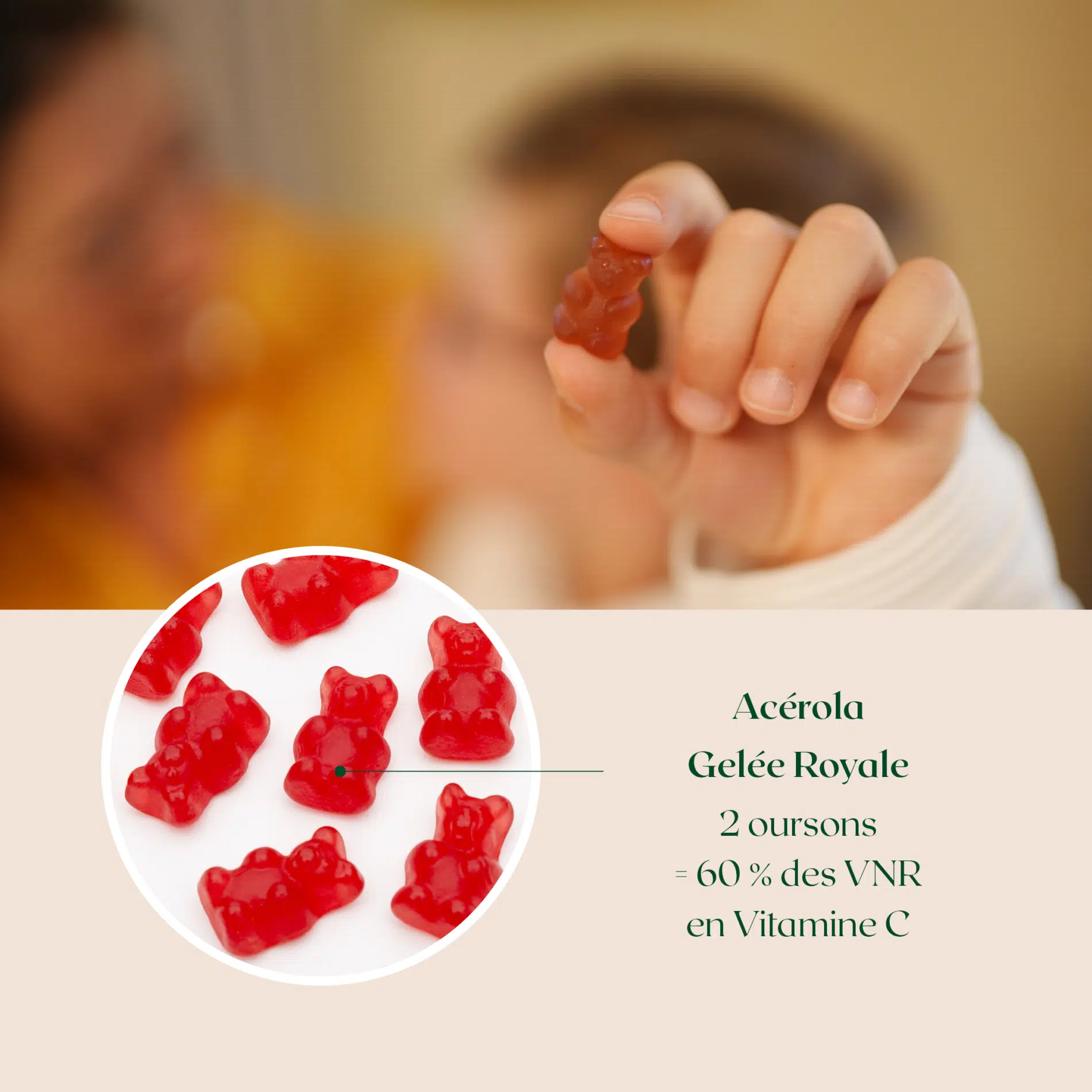 Nous voulions développer un complément alimentaire qui permettrait d’être en pleine forme et qui serait adaptés aux besoins des adultes et des enfants. Nous avons alors proposé un format familial, sous forme d’oursons à mâcher, au goût légèrement acidulé qui boosterait l’organisme lors des changements de saison. Des vitamines pour toute la famille.