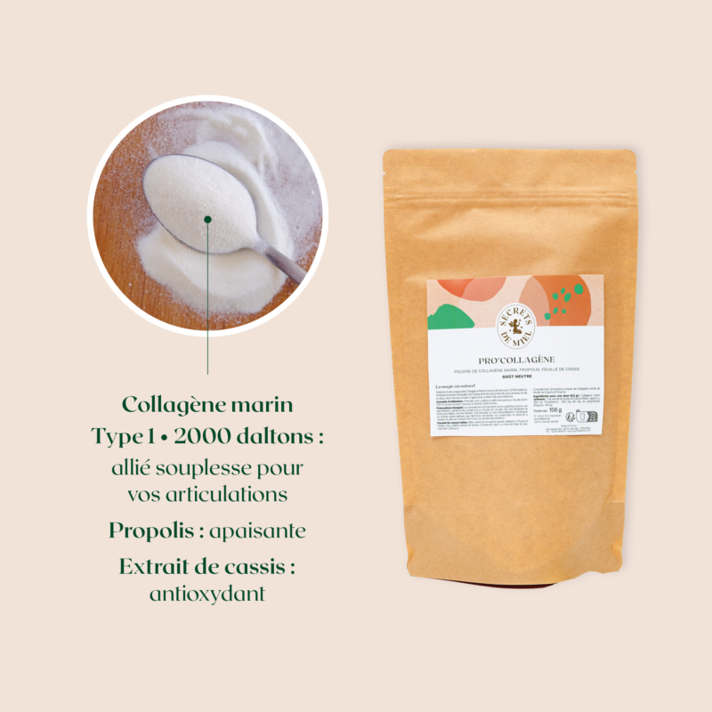 Cette formule unique allie Collagène Marin hydrolysé de type 1, 2000 daltons, Propolis et extrait de feuilles de Cassis titré en polyphénols. Son action globale sur l’organisme en fait un allié quotidien pour la beauté de la peau, des cheveux et des ongles, le confort des articulations et le bien-être intestinal.