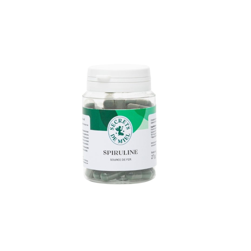 Ingrédients pour 2 gélules de 451mg: Poudre de Spiruline (origine France): 700mg (source de Fer: 2,4mg soit 17% VNR*), Gélule végétale, triglycérides d’acides gras.