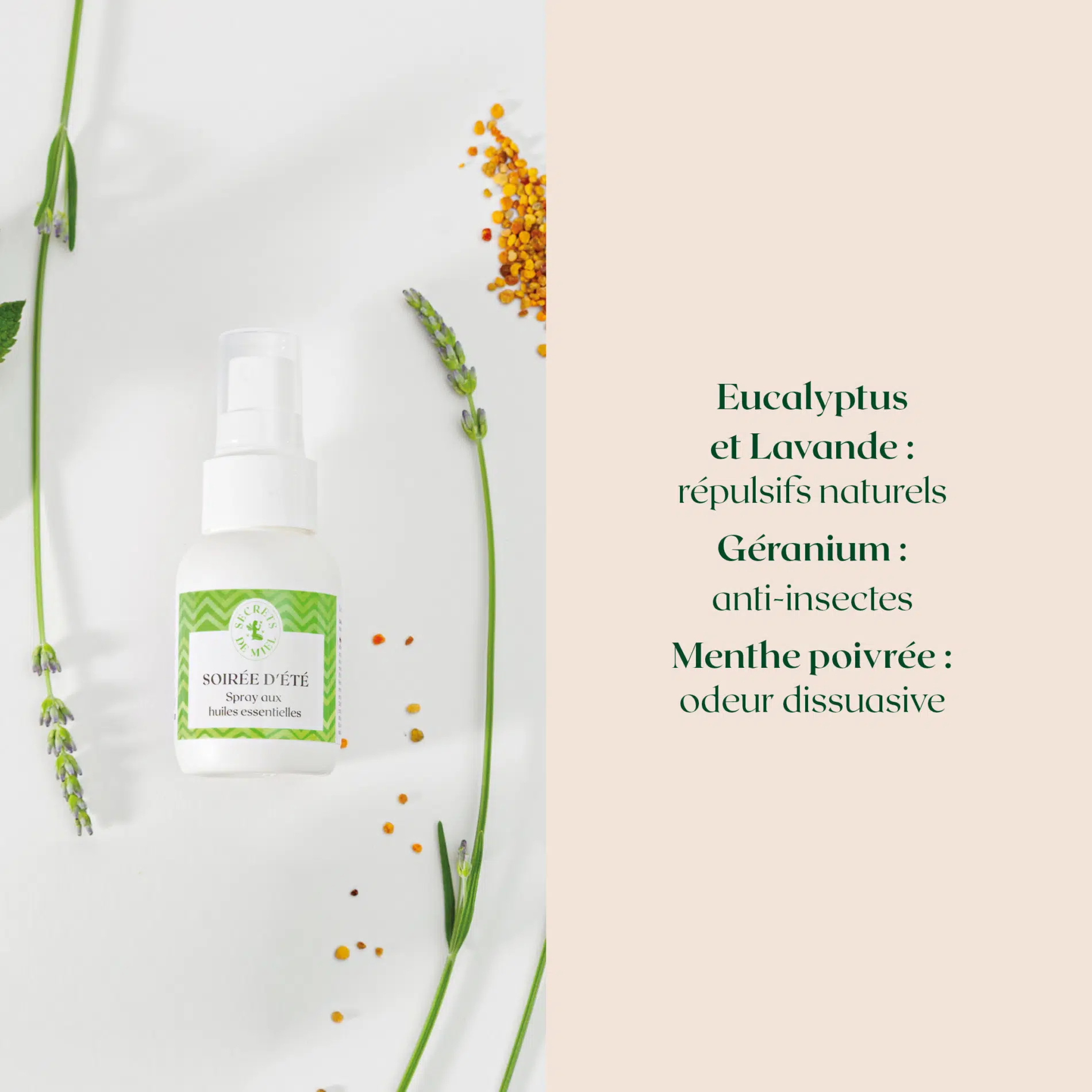 Les ingrédients : Sesamum Indicum Seed Oil (Huile de Sésame), Eucalyptus Radiata Leaf/Stem Oil (Huile essentielle d’Eucalyptus), Pelargonium Graveolens Oil (Huile essentielle de Géranium), Lavandula Angustifolia Oil (Huile essentielle de Lavande), Citronellol (Huile essentielle de citronnelle), Linalool (substance aromatique de plantes), Helianthus Annuus Seed Oil (Huile de Tournesol), Mentha Piperita Oil (huile essentielle de Menthe poivrée), Geraniol, Citral (Huile de citronelle), Pollen Extract (Pollen), Tocopherol (Vitamine E), Limonene, Coumarin (Fève tonka), Eugenol (clou de girofle)