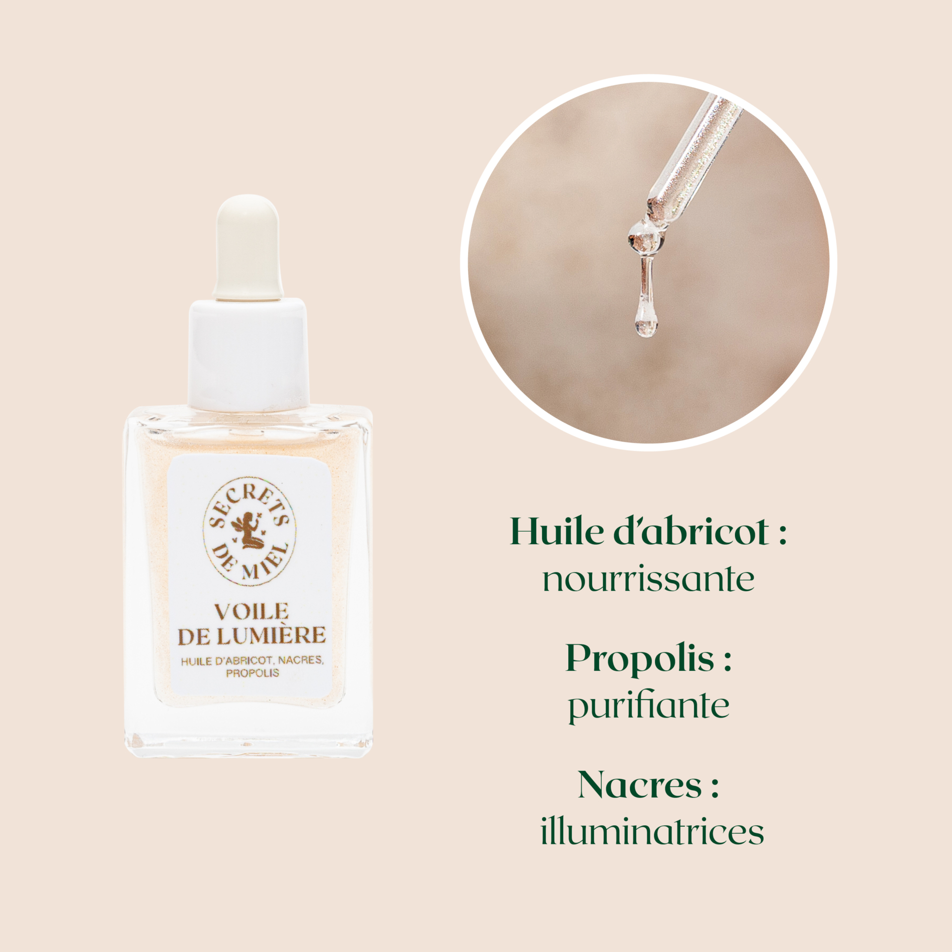 Voile de Lumière est un soin illuminateur conçu pour sublimer le teint avec un rendu naturel. Enrichi en huile d’Abricot, Propolis et nacres subtilement réflectrices, il réveille instantanément la lumière du visage, sans effet pailleté. Sa texture soyeuse fond sur la peau et laisse un fini doux et lumineux. Son parfum délicat apporte une touche de sensorialité à votre routine.
