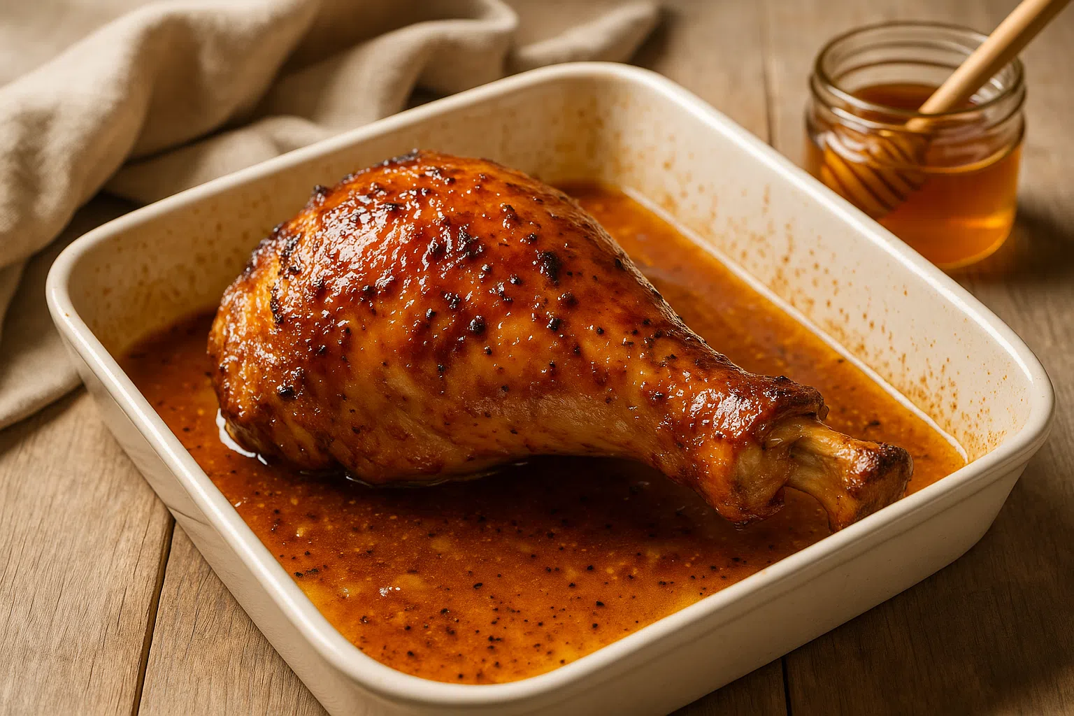Une cuisse de dinde dorée et caramélisée au miel, tendre à l’intérieur et croustillante à l’extérieur, cuite au four avec une marinade parfumée pour un plat convivial et savoureux.